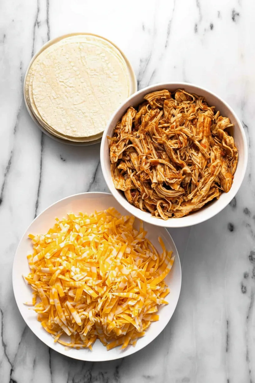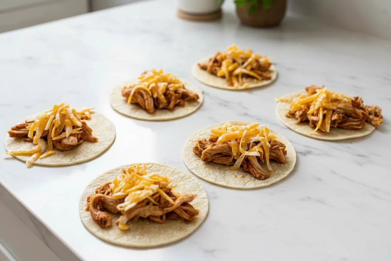 Place heaping tablespoons of shredded chicken on each tortilla, leaving space around the edges. Top chicken with equal amounts of shredded cheese. Distribute fillings evenly to prevent uneven cooking and ensure every bite delivers balanced flavor.