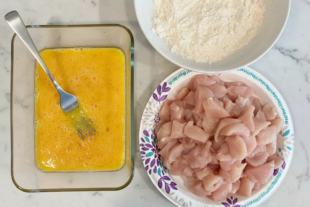 Cut chicken breasts into uniform one-inch cubes using sharp kitchen shears. Pat pieces dry with paper towels – this helps the coating stick better. Next, set up three bowls: one with flour, another with beaten eggs, and an empty plate for breaded chicken. Finally, heat vegetable oil in a large skillet over medium-high heat.