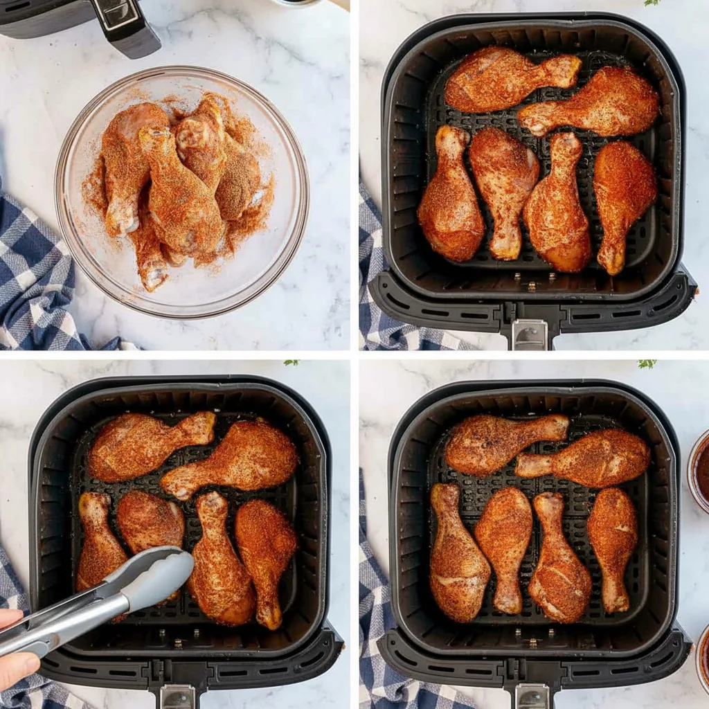 Sprinkle your seasoning blend evenly over the chicken. Toss vigorously, making sure every nook and cranny gets coated. Distribute the drumsticks in a single layer within your preheated basket—don’t overcrowd or they won’t brown properly.