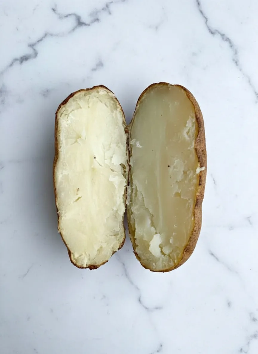 Two techniques ensure moist interiors. First don’t overcook your potatoes – check tenderness with fork at 35 minutes. Second add butter quickly after cutting open potatoes so it melts into the flesh.
