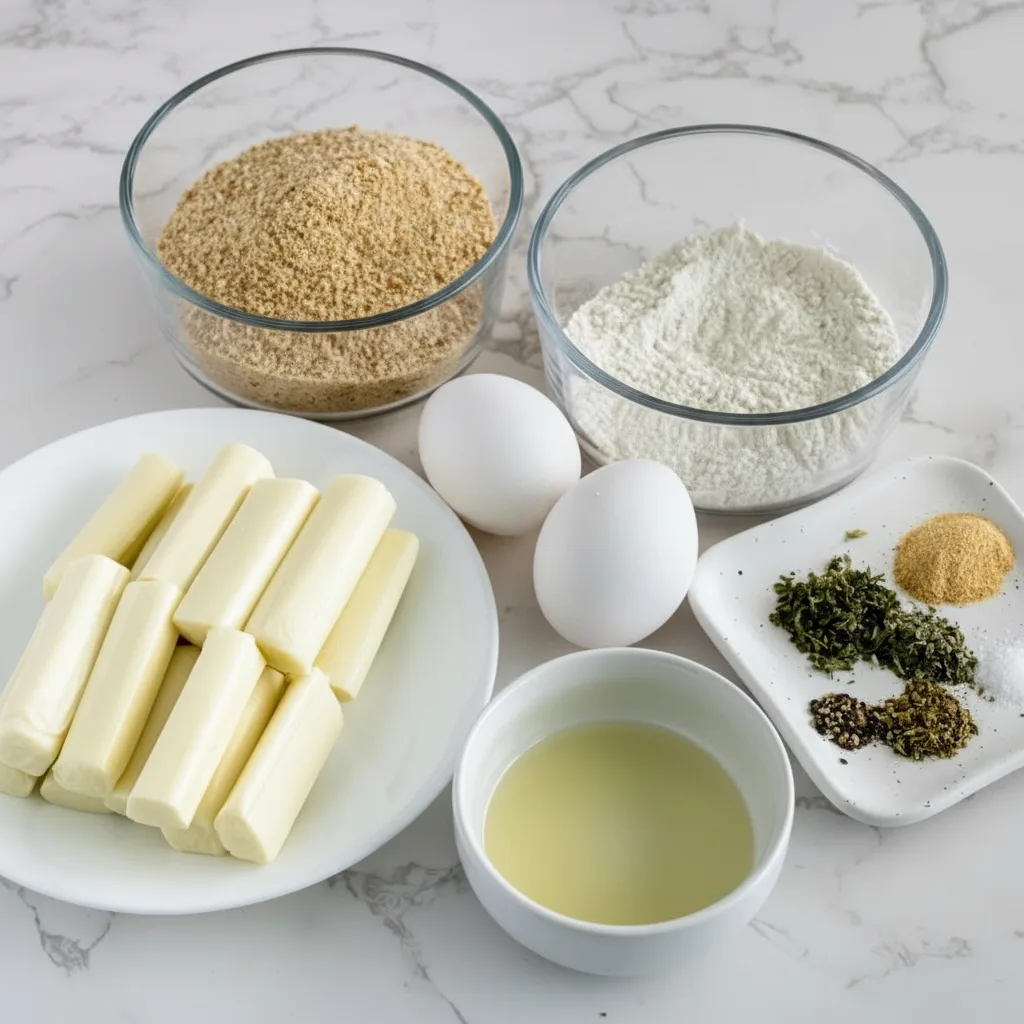 Cut each string cheese stick in half crosswise. This creates sixteen shorter sticks that cook evenly. Get your breading station ready with three shallow bowls: beaten eggs in the first, seasoned flour in the second, and oil-tossed panko in the third.