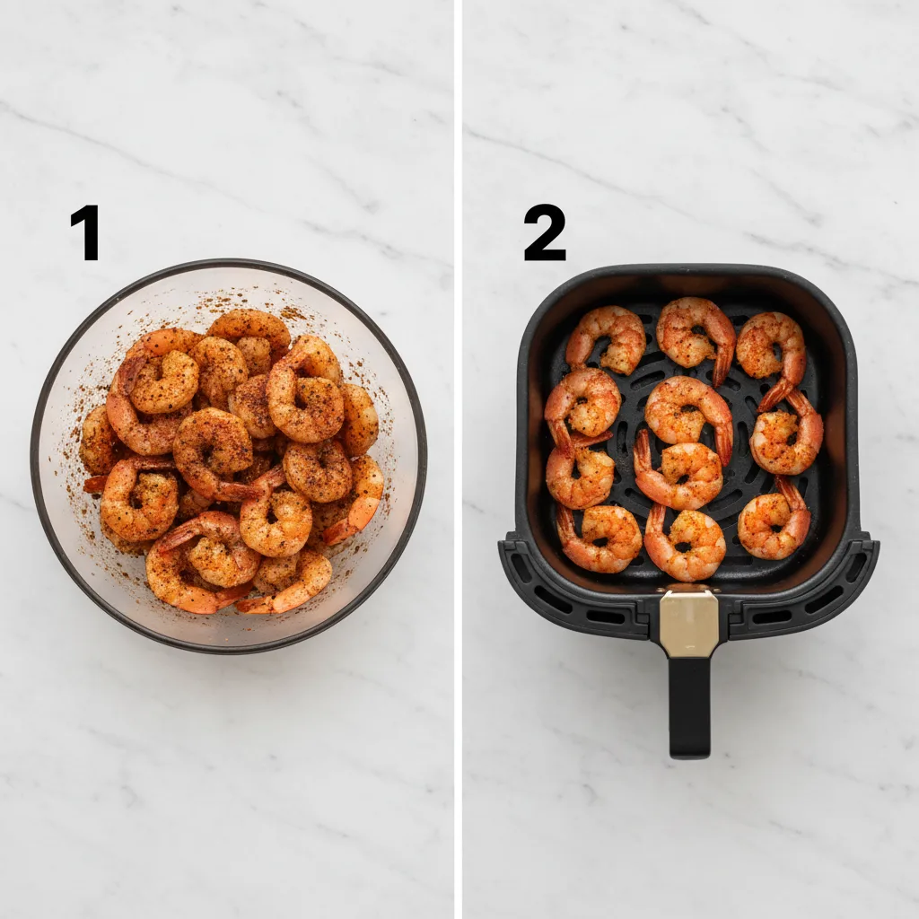 - Arrange the seasoned shrimp in a single layer in the air fryer basket.