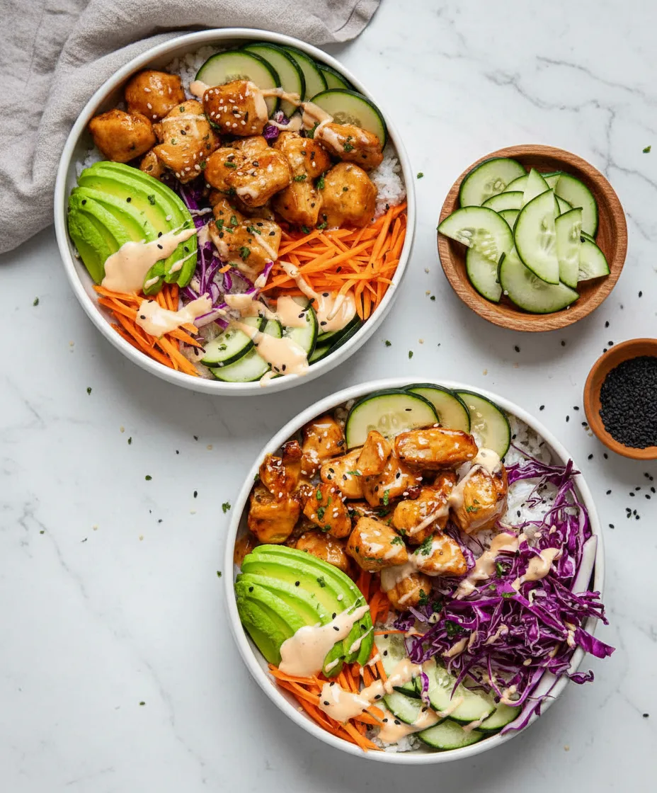 Get ready to experience bold flavors with this Bang Bang Chicken Bowl recipe that combines tender chicken, crunchy veggies, and a creamy sweet-spicy sauce.