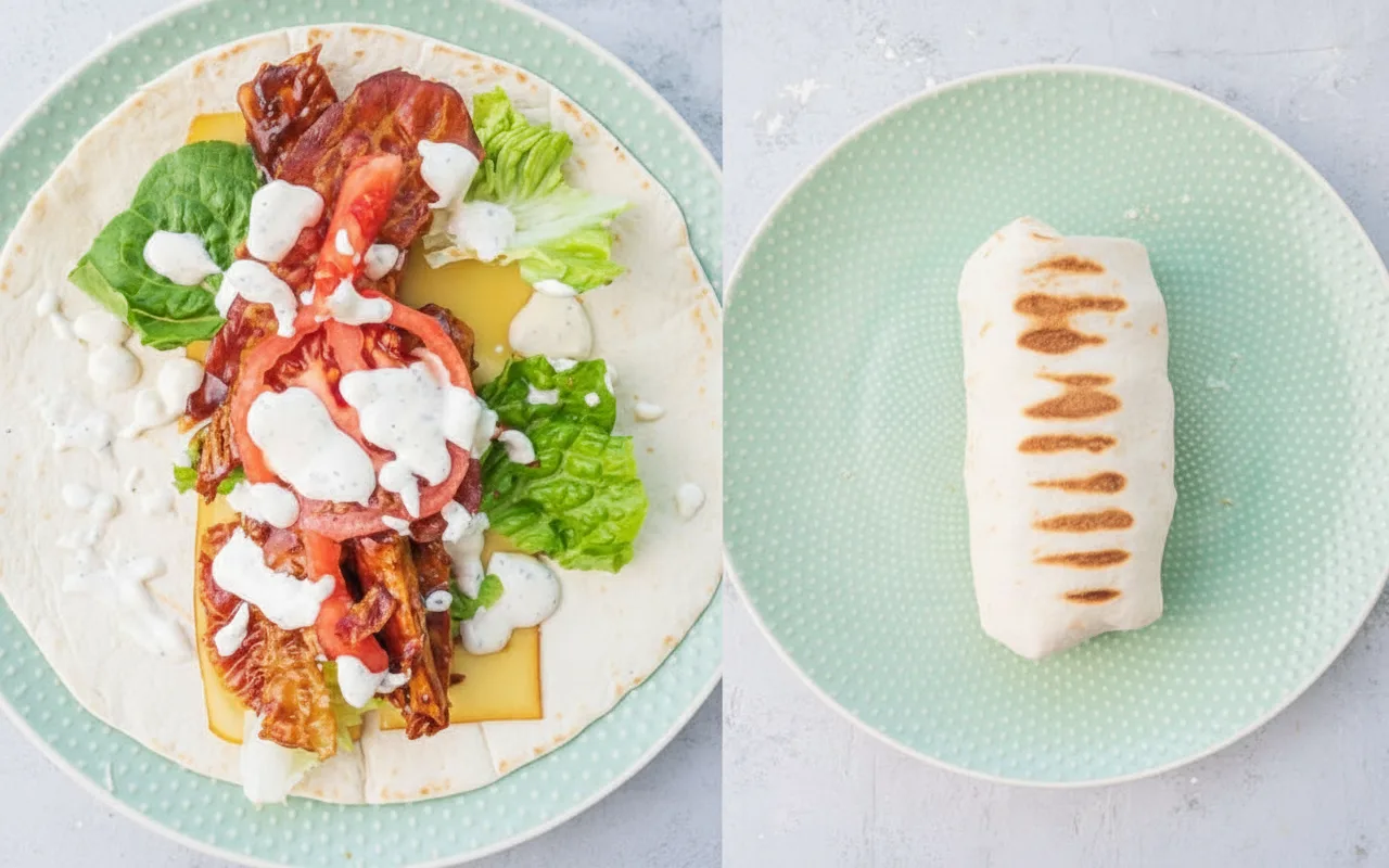 - Assemble wraps: Place 1-2 cheese slices on each tortilla, top with lettuce, chicken, turkey bacon, tomato, and ranch dressing.