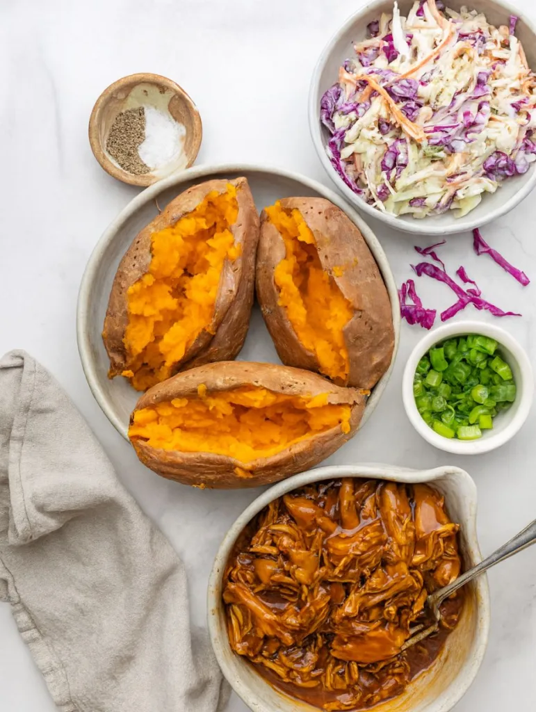 - Slice baked sweet potatoes open, fluff insides with a fork, and fill with barbecue chicken.