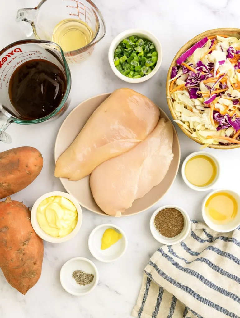 One of the best parts about this recipe is that most components can be made ahead. The chicken can be stored in its sauce in the fridge for up to three days. The coleslaw keeps well for a day, though you may want to toss it again before serving. And the baked sweet potatoes? They reheat perfectly in the oven or microwave.