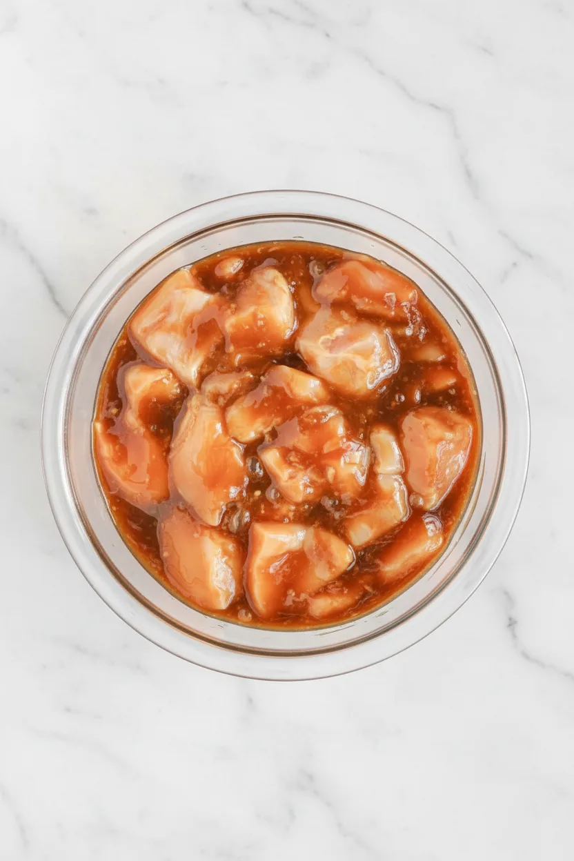- If desired, reserve 1/4 cup of sauce to brush on the chicken after frying. Then, place chicken pieces in a large mixing bowl and pour remaining sauce over chicken. Stir chicken and teriyaki so that all pieces are fully coated.