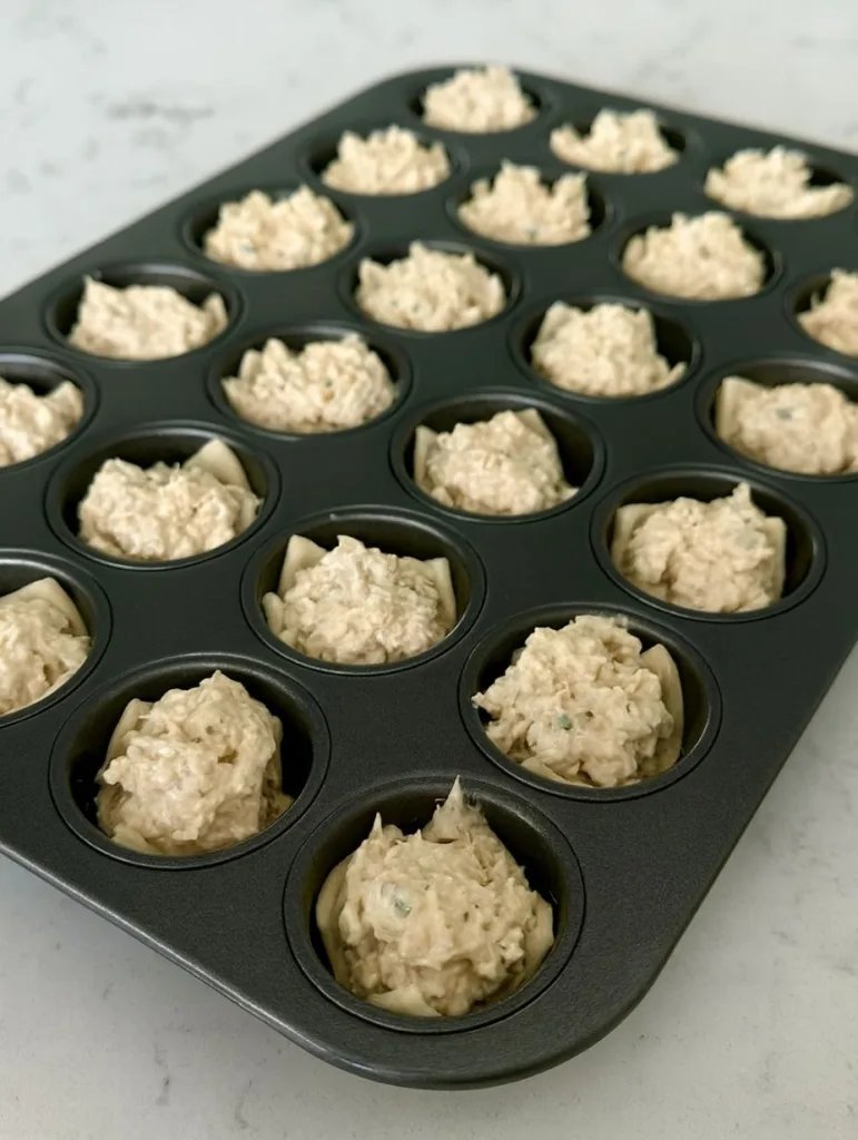 Use a small scoop or spoon to fill each dough cup with the chicken mixture. Bake for 15 minutes or until the tops are golden brown and the filling is bubbly.