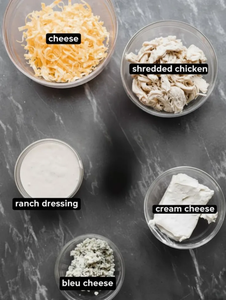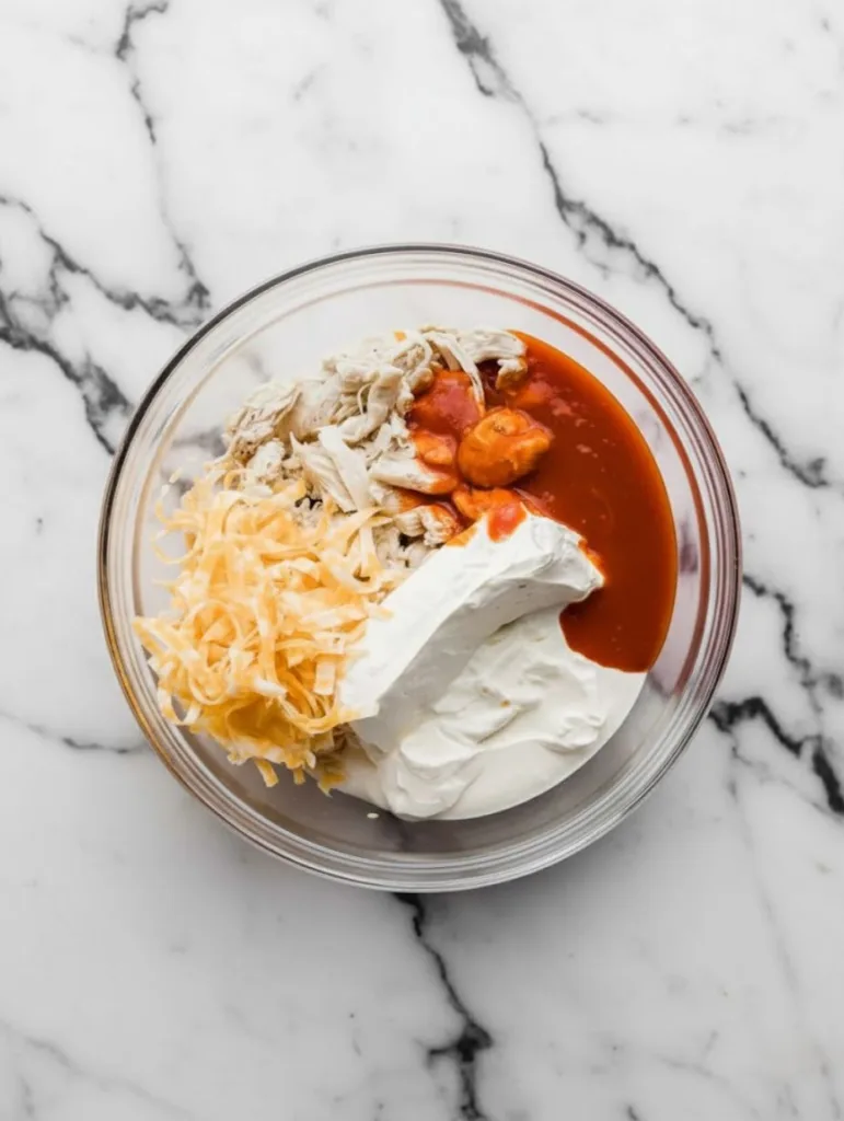 - In a large bowl, combine shredded chicken, cream cheese, buffalo sauce, ranch dressing, and 1 cup of Colby jack cheese.