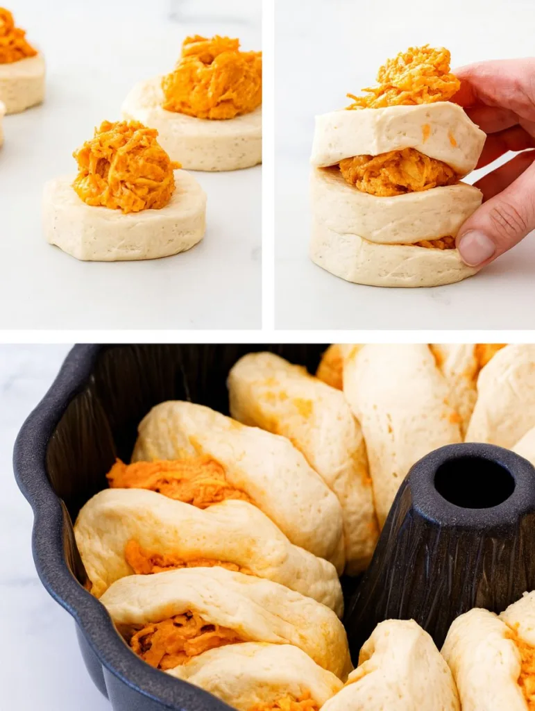 Separate the biscuits on a flat surface. Spoon about 1 1/2 tablespoons of the buffalo chicken filling onto each biscuit. Stack 3 or 4 filled biscuits together, then stand them upright in the greased bundt pan. Repeat until you’ve used all biscuits and filling, forming a complete ring. It will fit snugly, which helps it bake into a beautiful shape.