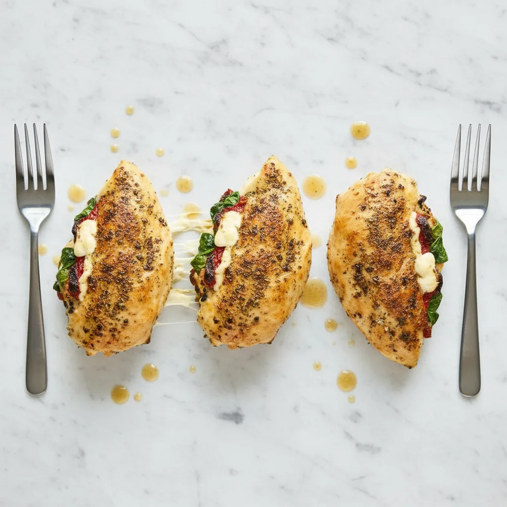 Juicy chicken breasts stuffed with fresh mozzarella, spinach, and sun-dried tomatoes, seared and baked to perfection for an elegant one-pan dinner.