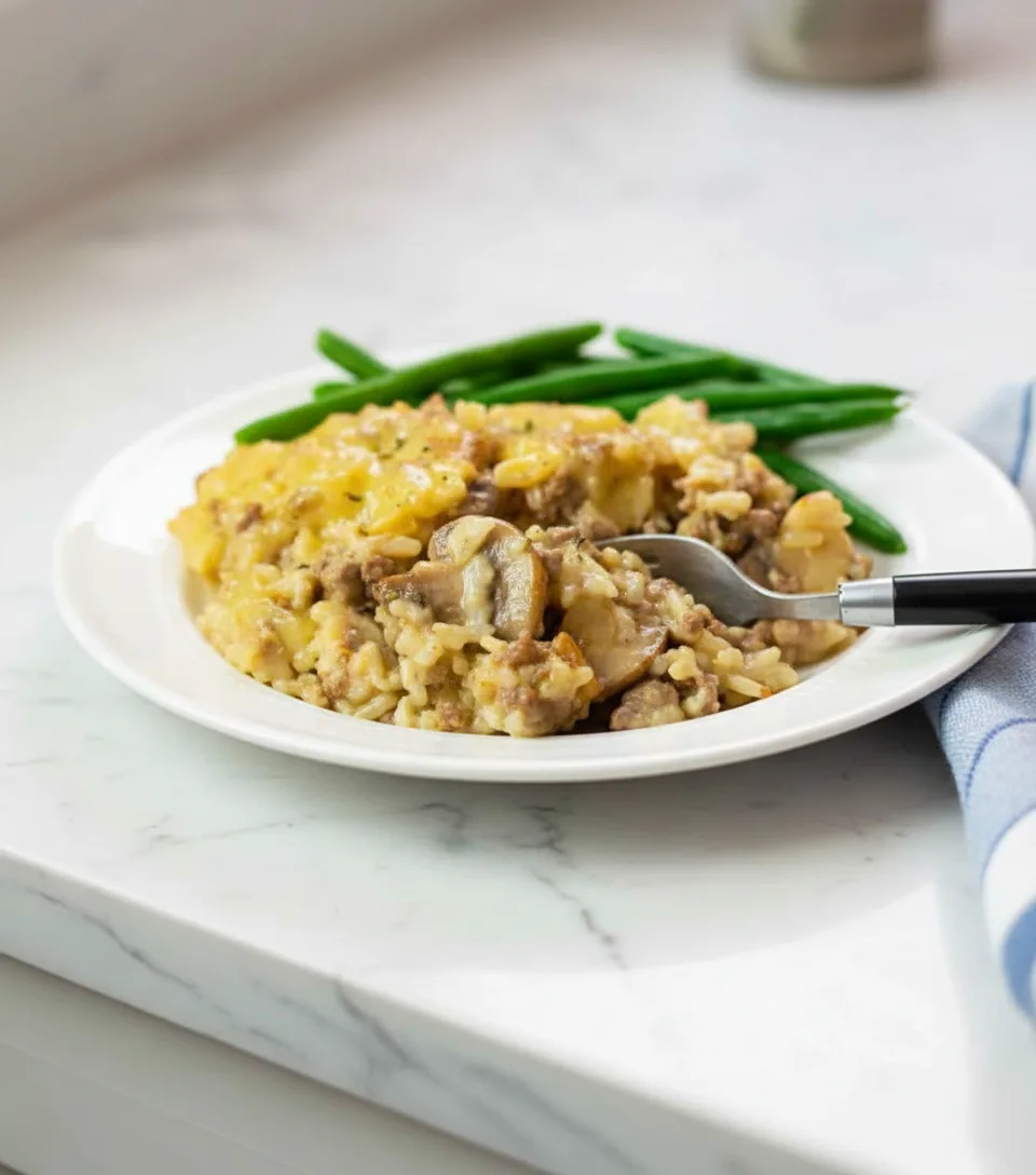 A comforting casserole combining seasoned ground beef, fluffy rice, cream of mushroom soup, and melted cheddar cheese for a family-favorite dinner.