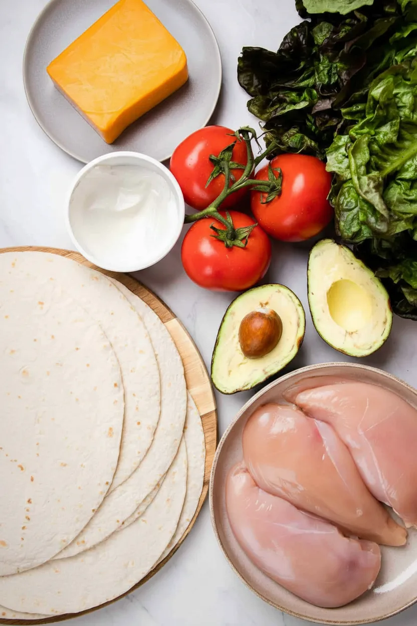 Lay tortillas flat on a clean surface. Spread 2 tablespoons sour cream across each center portion. Layer lettuce, tomato, avocado, and chicken strips down the middle. Sprinkle generously with shredded cheese. Keep fillings centered for easier rolling without squeezing out ingredients.