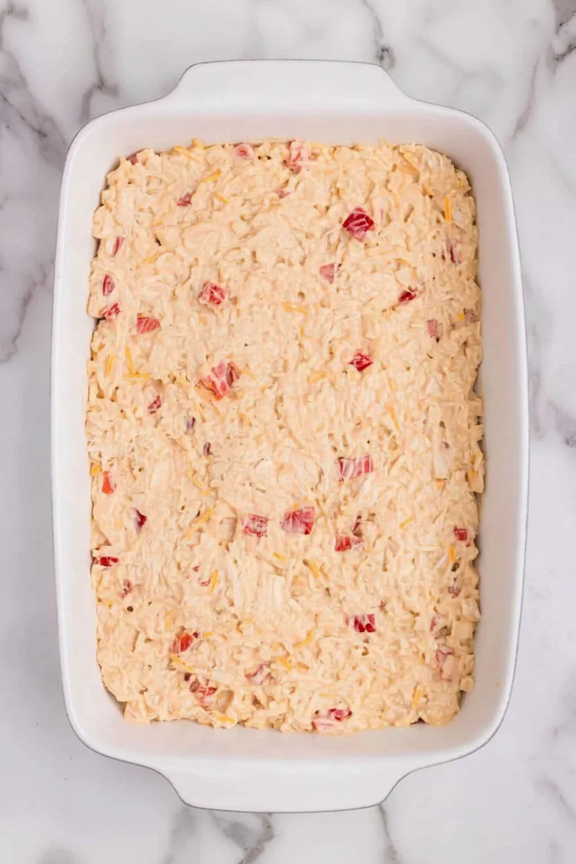 Start by heating your oven to 350°F (175°C). Coat a 9×13-inch baking dish with cooking spray to prevent sticking. Meanwhile, chop your onion and red bell pepper into small, even pieces—this ensures every bite includes their sweet crunch.