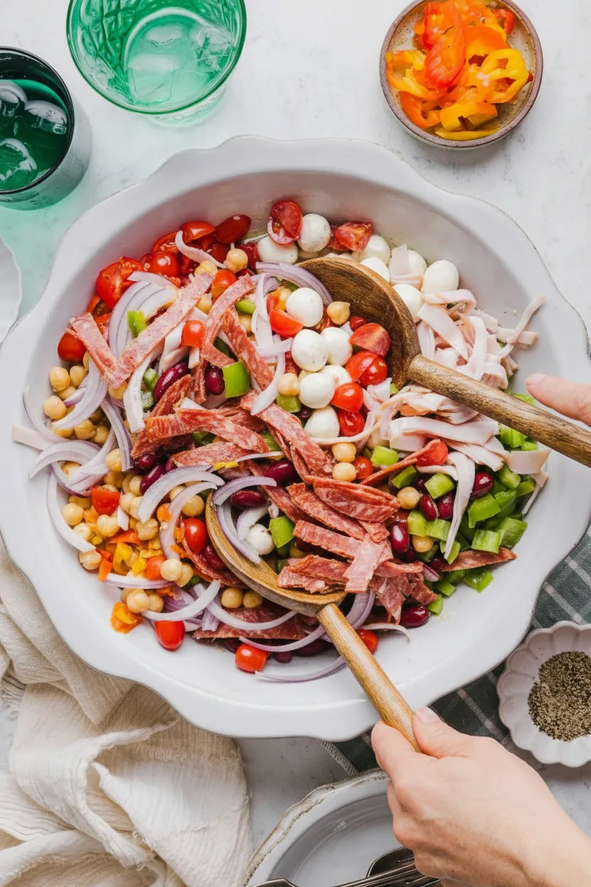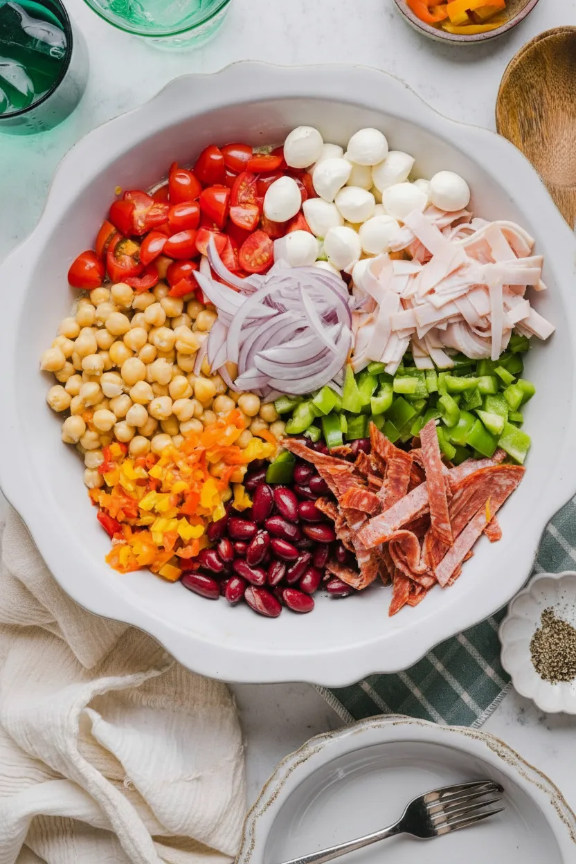 Add drained chickpeas, kidney beans, turkey pepper slices, diced cheese, tomatoes, bell peppers, onions, and banana peppers to the bowl. Using washed canned beans helps ensure freshness.