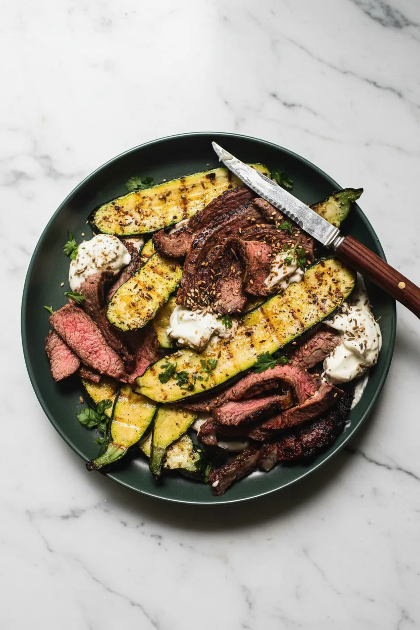 Preheat grill to high heat (450°F/230°C). Remove steak from marinade and discard excess liquid. Place steak and zucchini slices directly on grill grates. Cook steak for 3-5 minutes per side for medium-rare doneness. Grill zucchini until charred in spots and tender, flipping halfway through (5-10 minutes total). Transfer steak to cutting board and let rest five minutes before slicing against the grain.