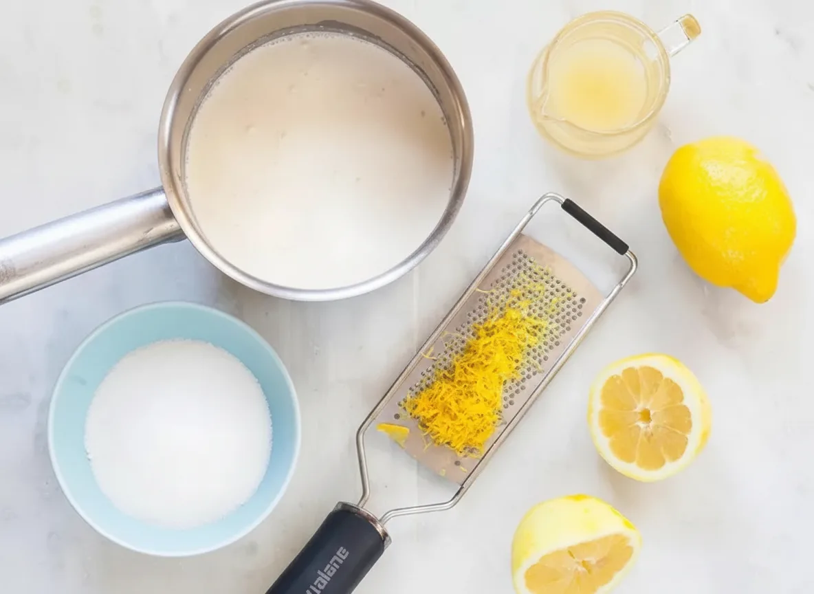 Place a medium saucepan over medium heat. Add the cream, sugar, and lemon zest. Stir continuously until the sugar dissolves completely. This usually takes about three minutes.