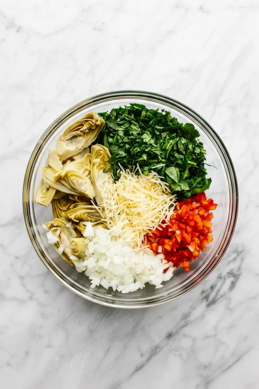 Add all prepared veggies, spinach, artichokes, and optional cheese to the bowl with chicken. Pour your dressing over the top and gently fold everything together until fully coated. Avoid over-mixing to prevent squashing delicate ingredients. The spinach will seem bulky at first but wilts beautifully during baking.