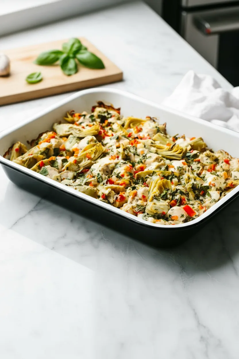 Each ingredient plays a vital flavor role while keeping prep straightforward. Chicken breast provides lean protein, but boneless thighs work beautifully for richer taste. Bell peppers and onions create aromatic depth-cut them finely so they soften during baking. Packed artichokes offer salty brininess-choose quartered hearts packed in water for best texture.