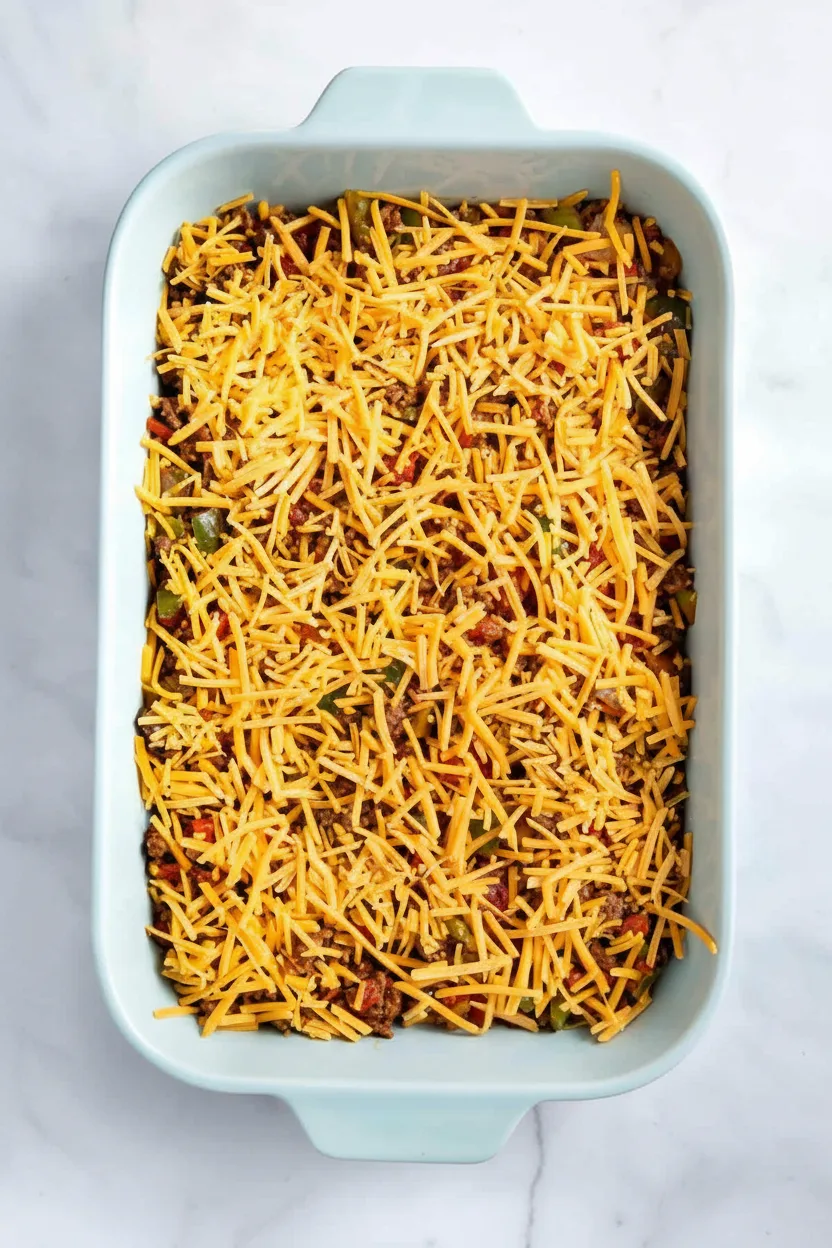 Unroll one package of crescent dough into your prepared baking dish, pressing seams together to form a solid base. The dough will puff slightly while baking, creating a perfect foundation for your filling. Next, spread the meat mixture over the dough followed by generous cheese.