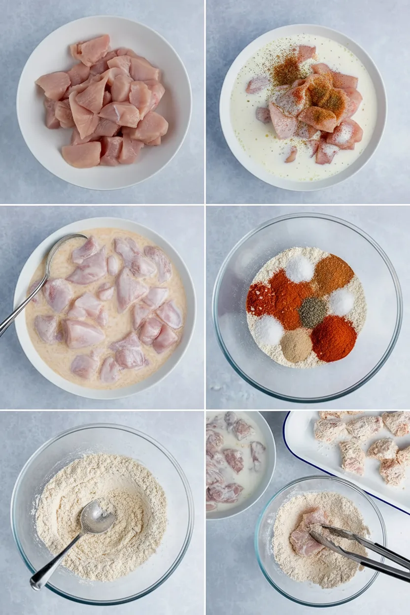 Ensure proper coating adhesion by shaking excess marinade before dredging. Let coated chicken rest for 5 minutes to help coating set properly before frying.
