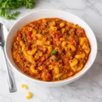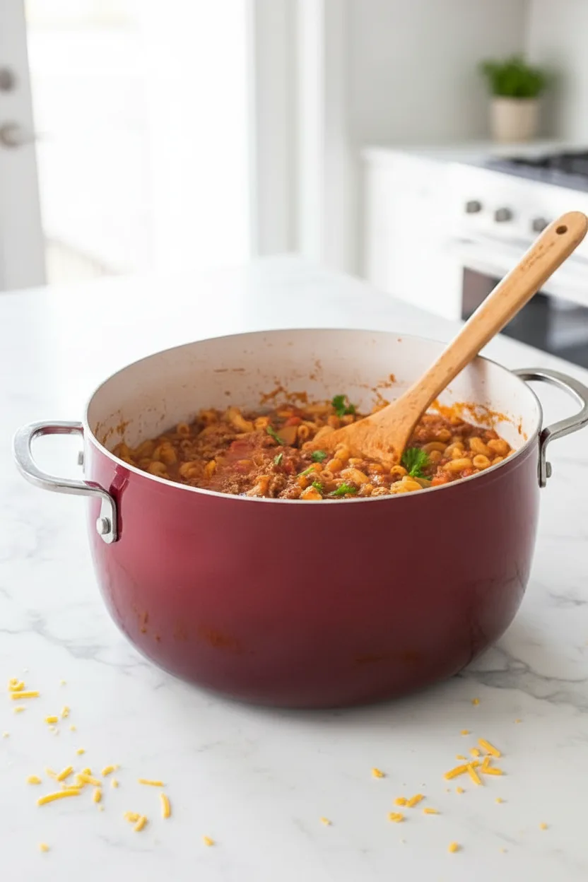A hearty one-pot goulash with ground beef, pasta, and rich tomato sauce topped with melted cheese