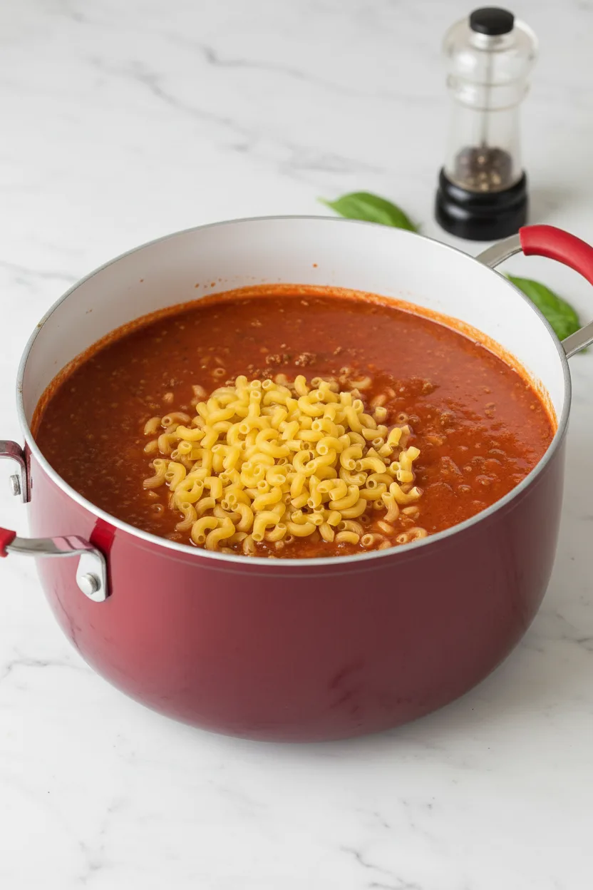 Bring the mixture to a boil, then reduce heat to maintain a gentle bubbling. Cook uncovered for 15-20 minutes, stirring occasionally to prevent sticking. The pasta should become tender while absorbing the savory tomato broth.