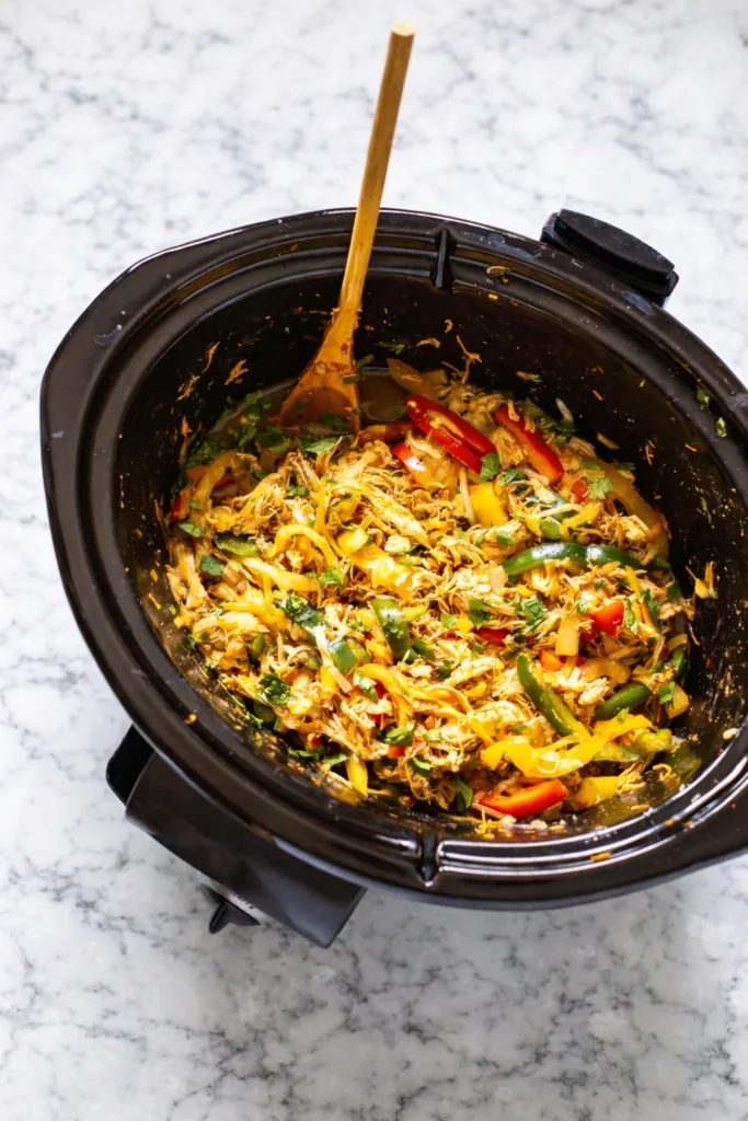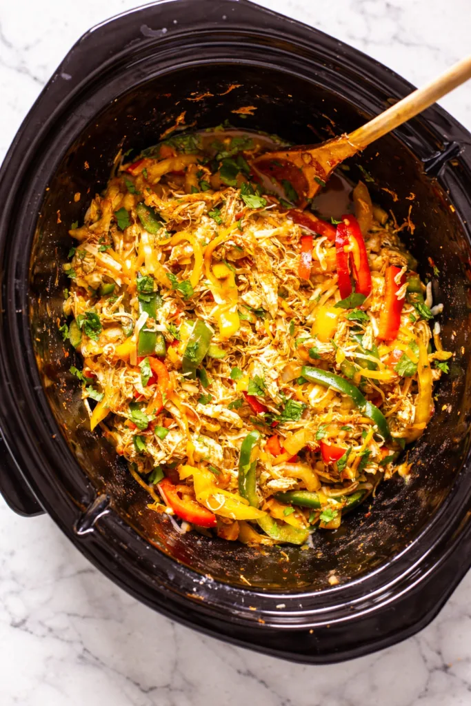 Tender shredded chicken and peppers cooked in bold Tex-Mex spices for an effortless slow cooker dinner.