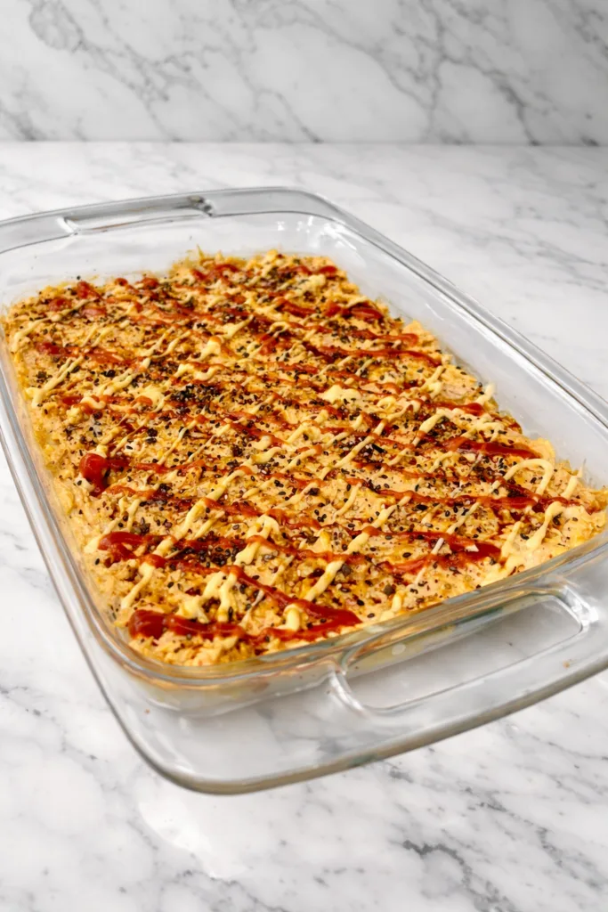 A deconstructed sushi casserole with creamy spicy salmon and seasoned rice layers baked to perfection