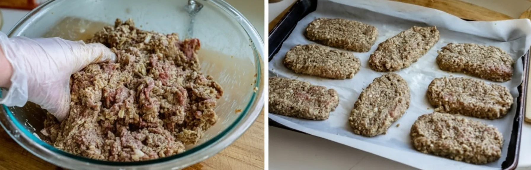 Wear disposable gloves for easier handling. Mix ingredients thoroughly using your hands until well combined. Shape the mixture into 10 oval patties, placing them on the prepared pan without touching. Bake for 15-20 minutes until the internal temperature reaches 160°F (71°C) on a meat thermometer. Remove from oven and cover to keep warm.