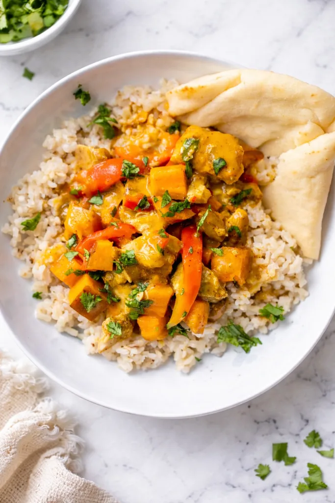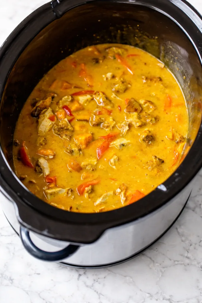 Aromatic slow cooker chicken curry packed with sweet potatoes and bell peppers in creamy coconut sauce