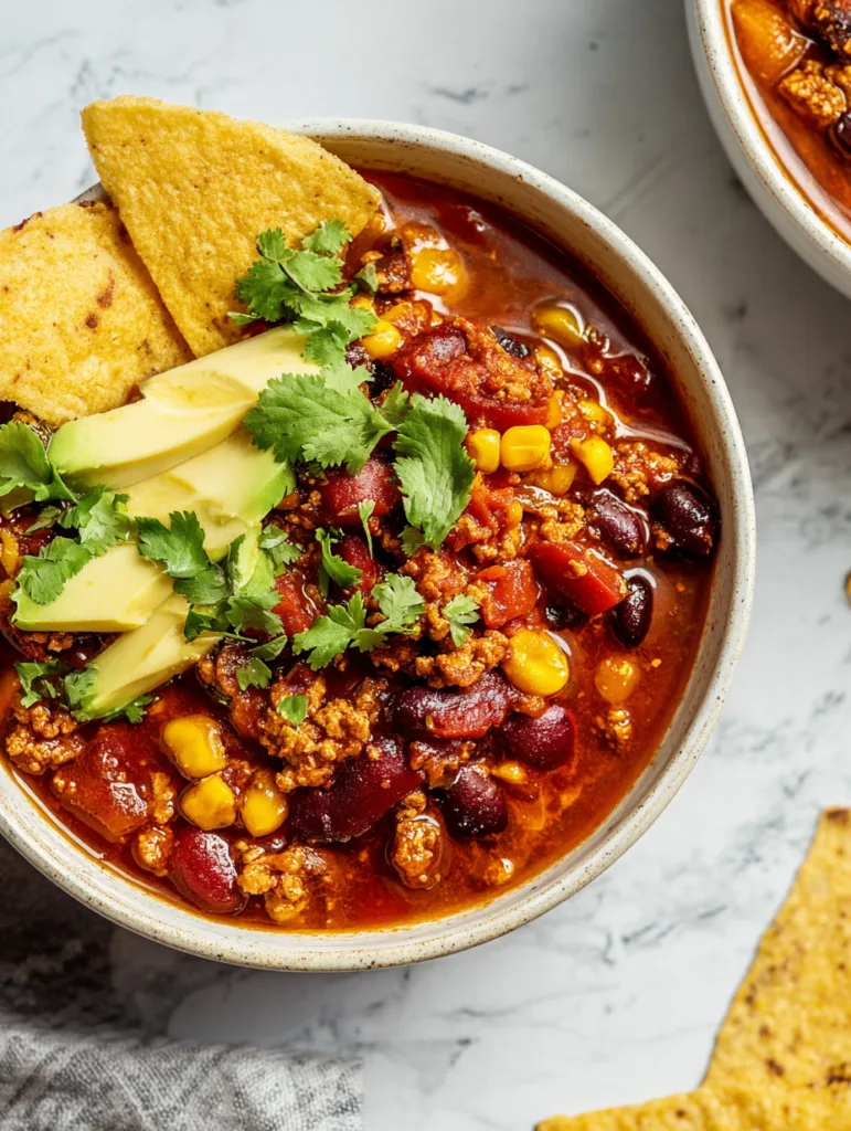 A hearty and flavorful turkey chili made with lean ground turkey, beans, corn, and warming spices. Perfect for weeknights, game days, or meal prep.