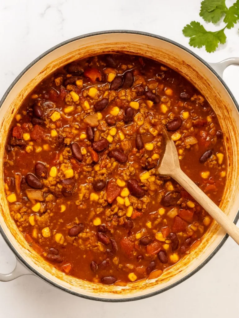 Chili doesn’t have to be fiery to be flavorful. The mild chili powder and a pinch of cayenne give this recipe a gentle kick without overpowering the dish. The corn adds natural sweetness that rounds out the spice beautifully.