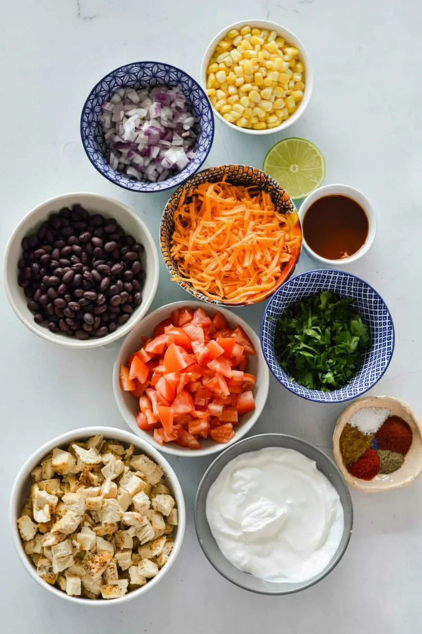 - To a large mixing bowl, add diced chicken, black beans, corn, tomatoes, red onion, cilantro and cheese.