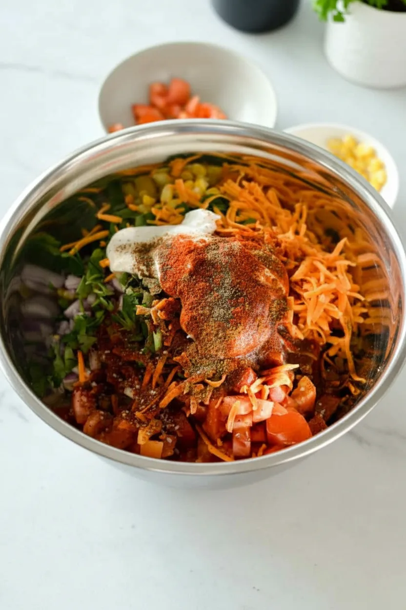 Sprinkle salt, pepper, cumin, paprika, and chili powder evenly across the bowl. These spices create signature Southwest flavors. For extra zing, squeeze fresh lime juice over everything before mixing to distribute flavors evenly.
