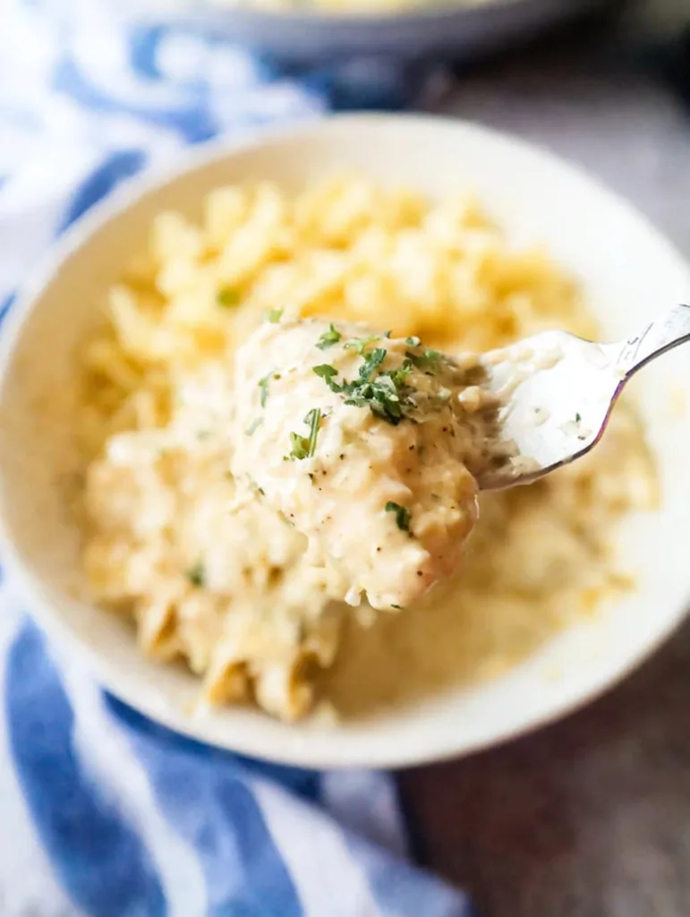 Cook your noodles separately according to package instructions. When the chicken is done, gently shred it with a fork and stir it into the creamy sauce. Serve the chicken mixture over the noodles or stir them together in the slow cooker for a one-pot meal.