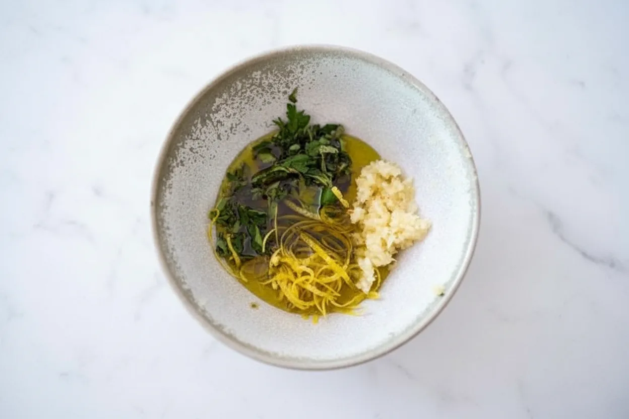 Next, make the marinade. In a small bowl, combine the chopped fresh herbs, lemon zest, garlic, kosher salt, pepper, optional chili flakes, and olive oil. Mix them well until they form a fragrant paste. Importantly, set aside two tablespoons of this marinade in a separate small bowl for later use as a finishing sauce.