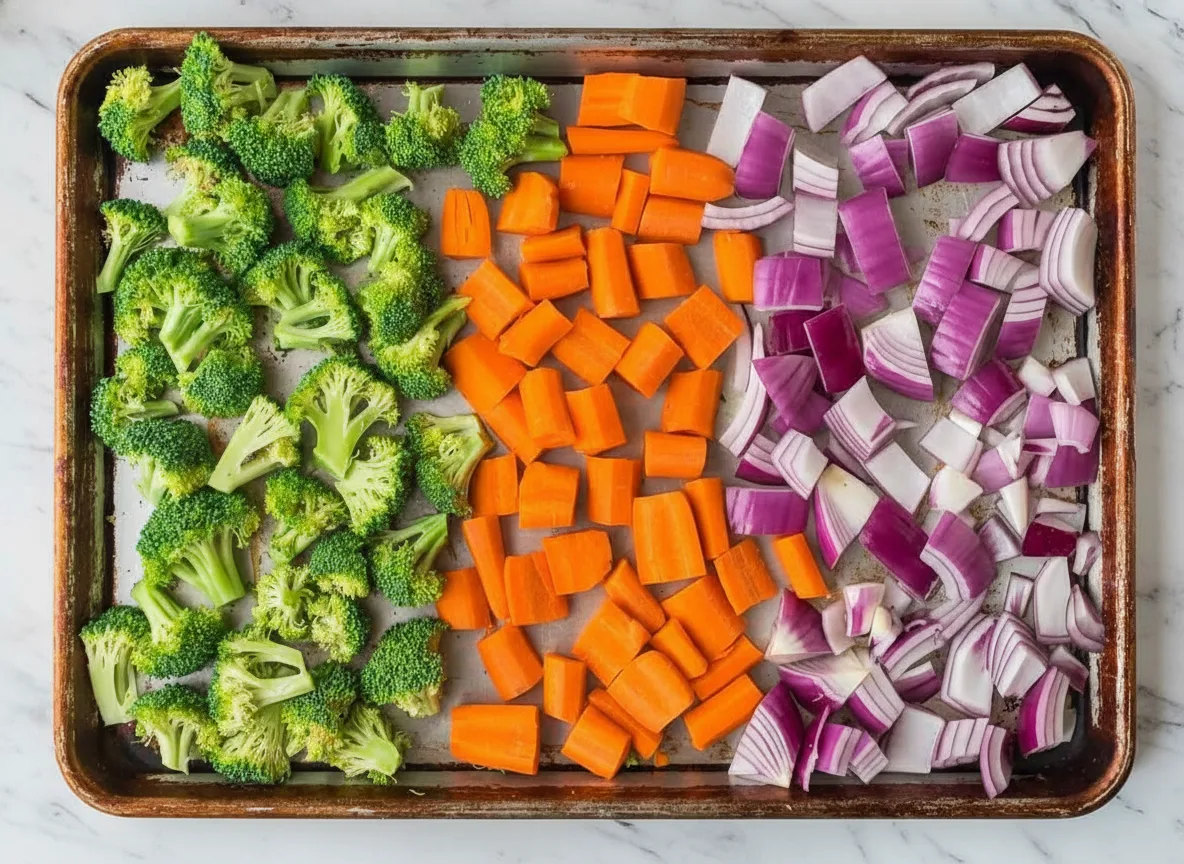 Preheat your oven to 400°F (200°C). Lightly coat a large baking sheet with cooking spray. Arrange evenly sliced carrots, broccoli florets, and red onion chunks across the pan. Cutting vegetables to similar sizes ensures uniform roasting.