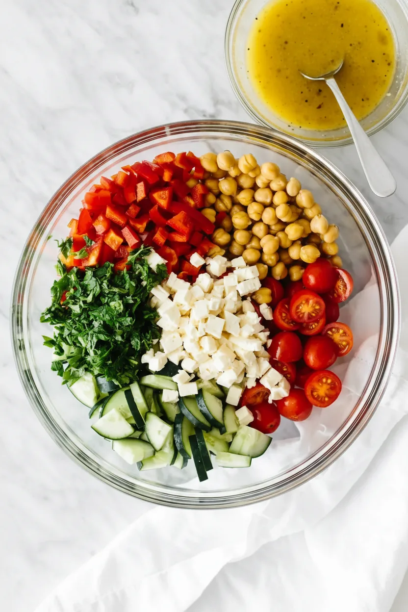 First, gather all your ingredients. Drain and rinse the canned chickpeas in a colander. Let them shake off any excess water. Next, wash and chop your fresh vegetables. Dice the cucumber and red bell pepper into similar-sized pieces. Halve the cherry tomatoes. Finely dice the red onion. Chop the fresh parsley. Crumble the block of feta cheese with your fingers or a fork. Having everything prepped and ready makes the assembly a breeze.