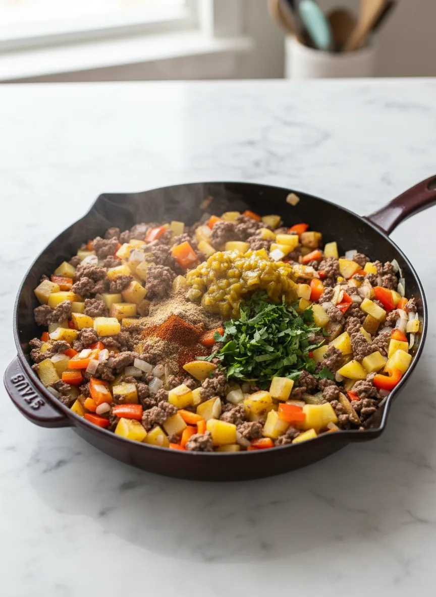 - Stir in green chiles, chili powder, cumin, smoked paprika, and cilantro. Cook 6-8 minutes until potatoes are tender and beef is cooked through.
