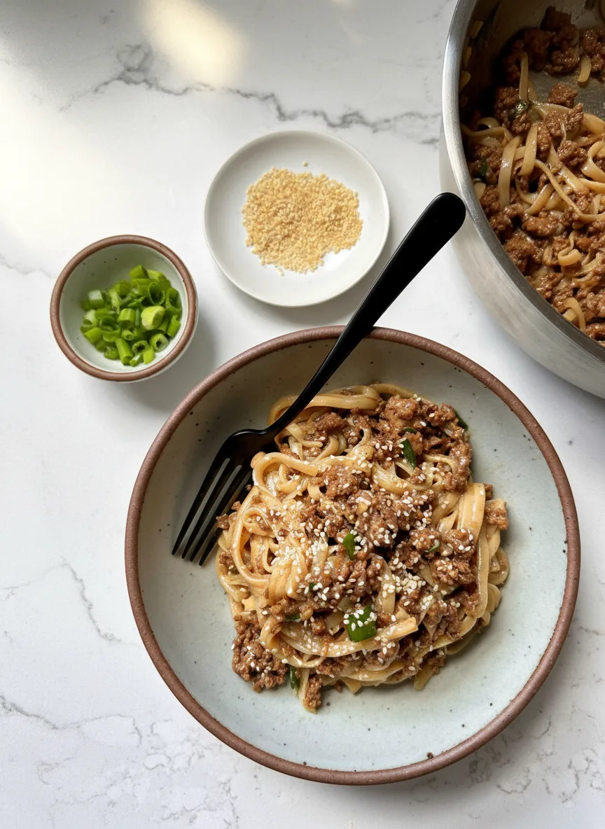 Pour prepared sauce into the skillet with cooked beef. Stir continuously as the mixture thickens – about 1 minute. Remove from heat before adding noodles. Toss everything gently until noodles wear the sauce like a glossy coat. Fold in green onions and sesame seeds last for freshness and crunch.