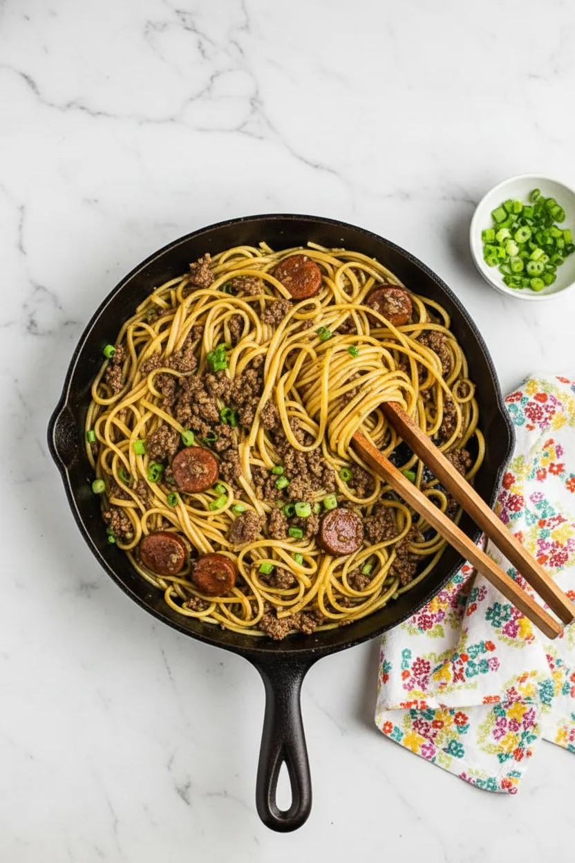 This Mongolian Ground Beef Noodles recipe delivers maximum flavor with minimal effort. The sweet-savory sauce clings perfectly to tender noodles, while green onions add freshness. With straightforward techniques and common ingredients, it’s accessible even for novice cooks.