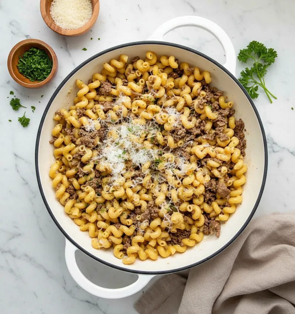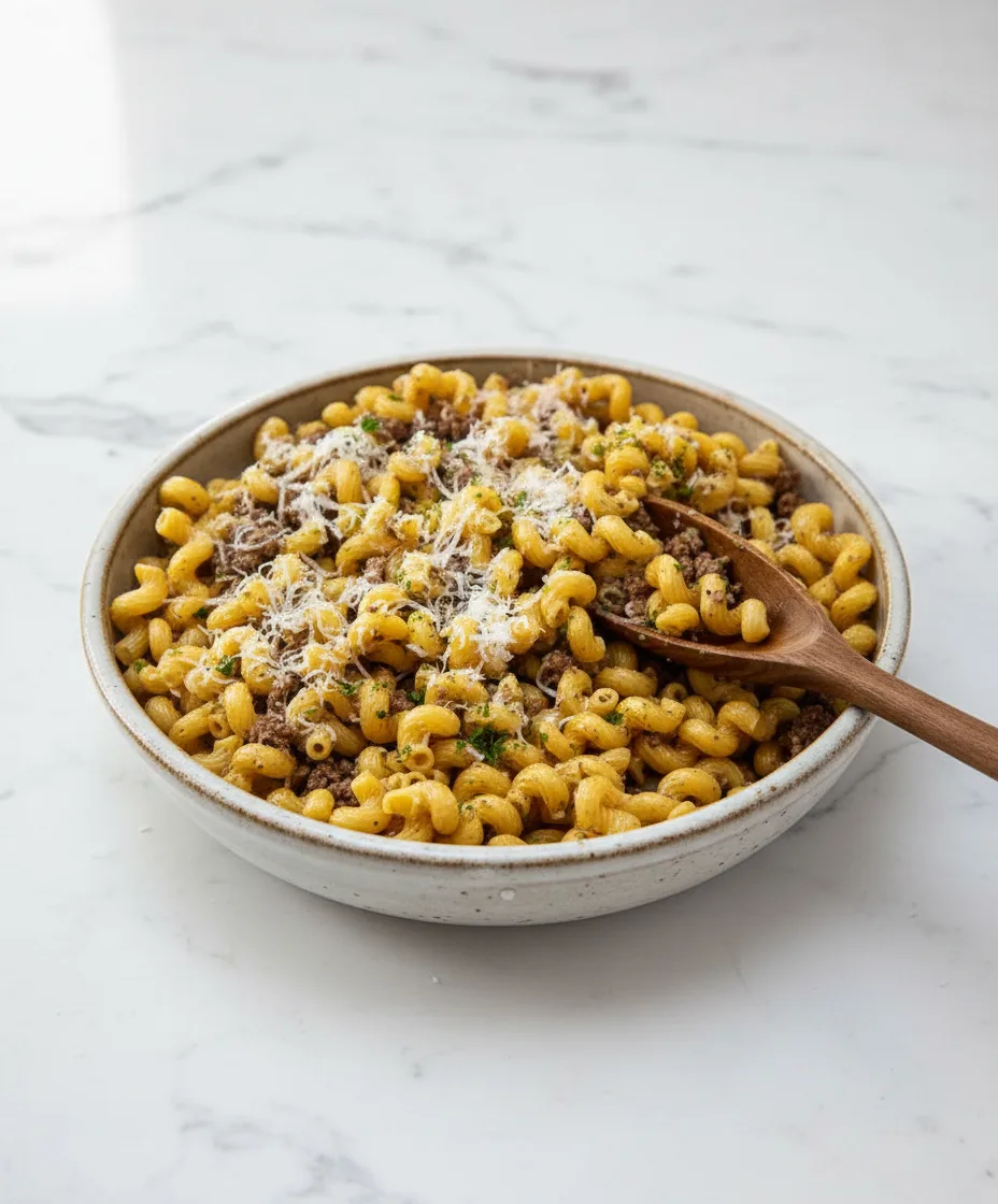 A rich and comforting one-pot pasta featuring savory ground beef, garlic butter sauce, and tender cavatappi noodles, ready in 30 minutes.