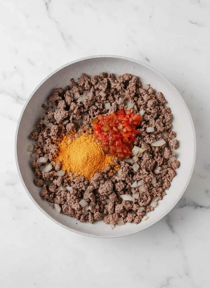 Next, brown ground beef and onions over medium heat in a skillet. Drain excess grease using a slotted spoon before stirring in taco seasoning and salsa.