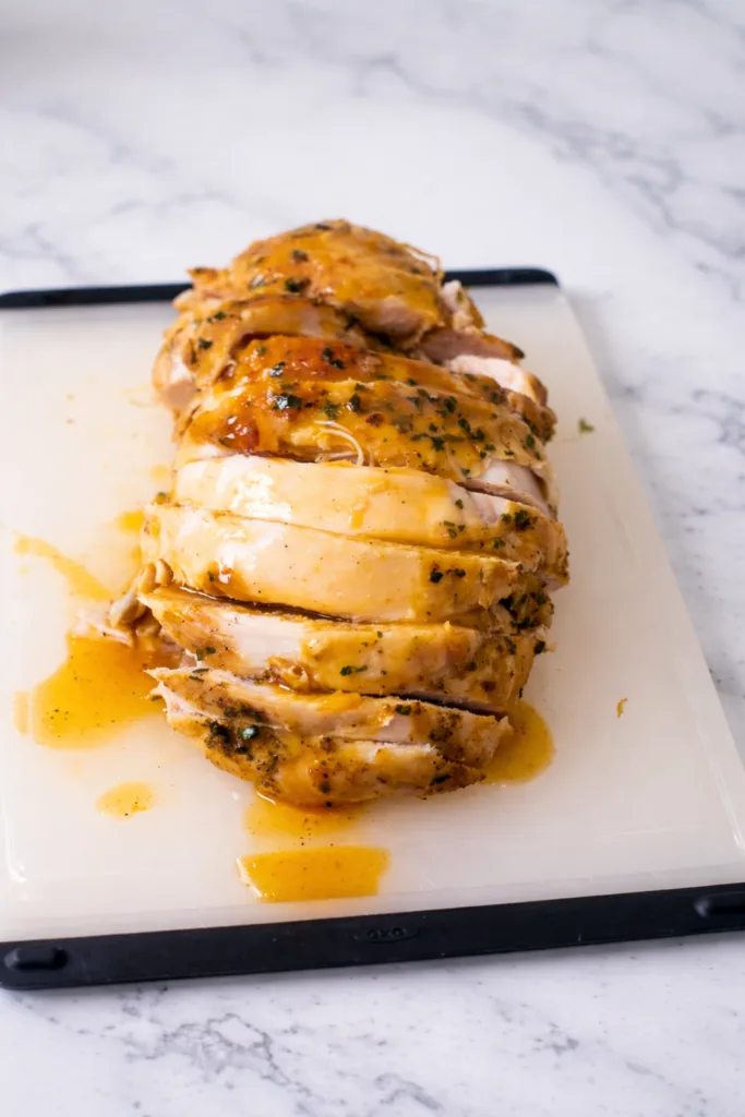 Let turkey rest 15 minutes before slicing to redistribute juices. Carefully remove netting before carving against the grain into 1/2-inch slices. Use a sharp chef’s knife for clean cuts.