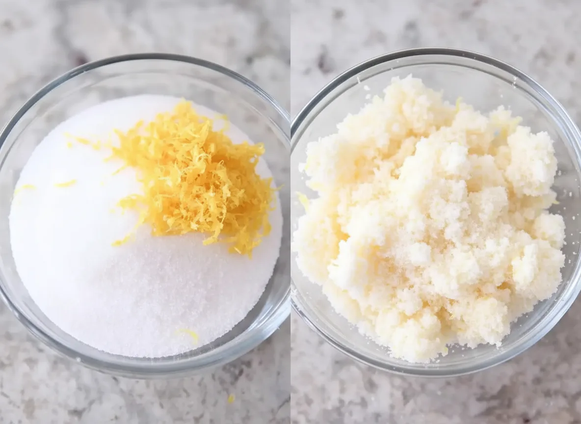 - For the lemon sugar, combine the sugar and zest in a bowl and rub the lemon zest into the sugar with your fingers until super fragrant and the zest and sugar are evenly and well combined. Set aside.