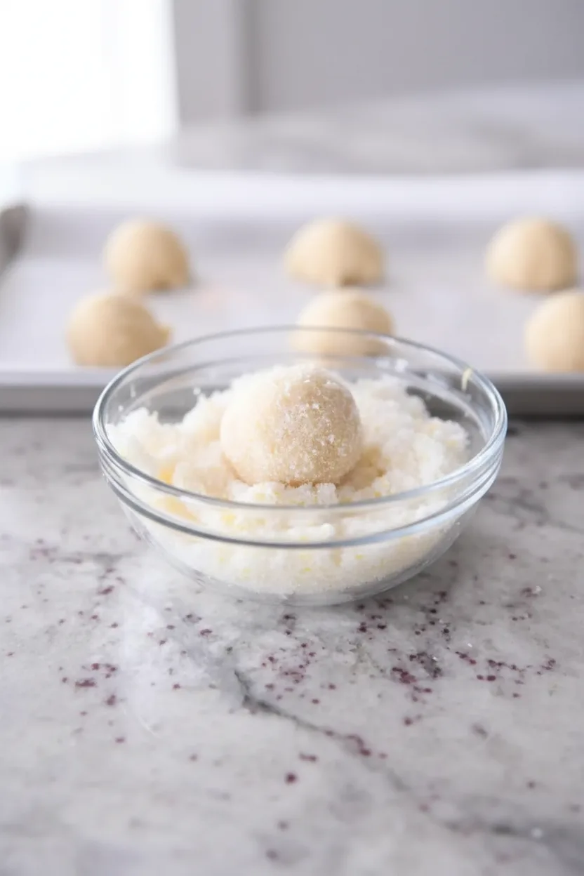 Start by combining one-third cup of granulated sugar with two to three teaspoons of fresh lemon zest in a small bowl. Use your fingers to rub the zest into the sugar. This process releases the essential oils and creates an incredibly fragrant lemon sugar. Set this mixture aside for coating the dough balls later.