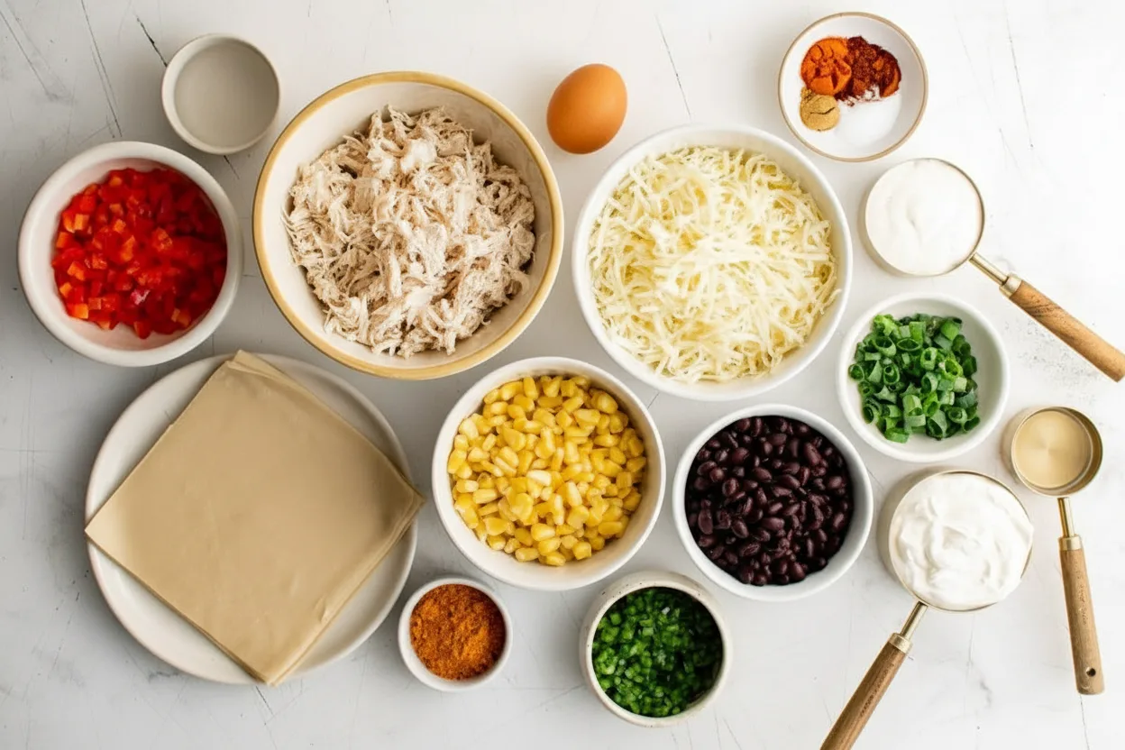 - In a large mixing bowl, combine corn, black beans, bell pepper, jalapenos, green onions, chicken, cheese and seasonings; set aside.