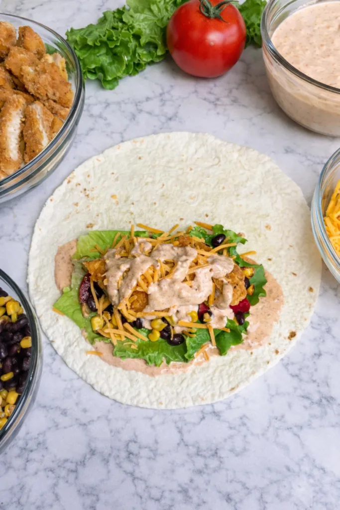 - Start assembling your chicken wraps by adding a couple Tbsp. of the southwest dressing to the lower half of the tortilla. Add romaine lettuce, sliced tomatoes, black beans, corn, chicken strips, and drizzle more southwest dressing on top.