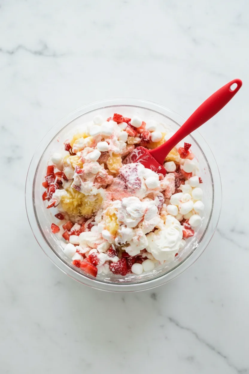 Using a spatula, gently fold in mini marshmallows, shredded coconut, and chopped strawberries. Avoid overmixing to maintain airy texture. Transfer to a serving dish, cover tightly, and refrigerate for at least one hour before serving. Chilling allows flavors to meld and creates the perfect scoopable consistency.